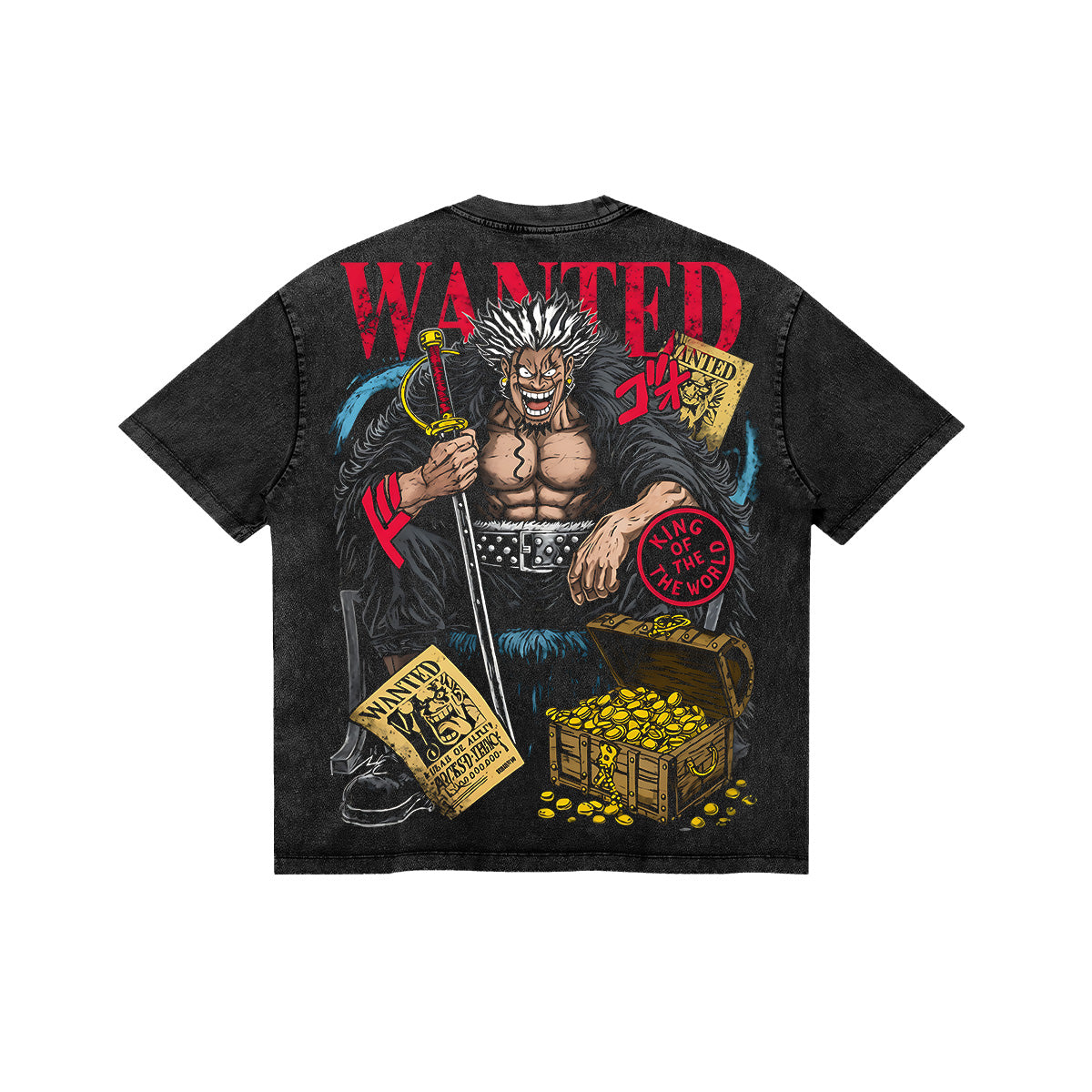 The Ultimate Taboo. A high-impact tribute to the man whose name was erased from history. The front of this mineral-washed tee features the aggressive "ROCKS PIRATES ZNK" typography in blood-red, while the back reveals a breathtaking, full-color masterpiece of Rocks D. Xebec seated upon a throne, surrounded by chests of gold and his own terrifying "Wanted" posters. With jagged blue energy and bold crimson accents, this design captures the raw, chaotic power of the man who dared to become King of the World. Set against a premium dark canvas, it’s a piece for those who aim for the top and fear no legend.