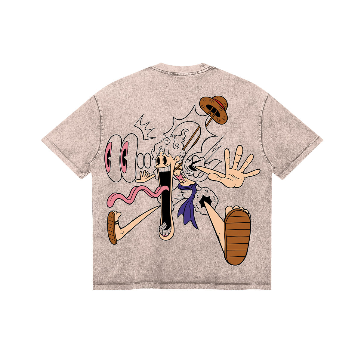 Freedom in its purest form. A whimsical and high-energy tribute to Luffy’s peak awakening. The front of this sand-washed tee features a bold, graffiti-style ZENKAI logo with a tiny, laughing Gear 5 Luffy perched on top. The back is a riot of chaos and color, showcasing Luffy in a classic "old-school cartoon" aesthetic—eyes popping out, tongue lolling, and limbs rubberized to the extreme. This design captures the moment the world heard the Drums of Liberation. A vibrant, fun, and definitive essential for those who fight with a smile.