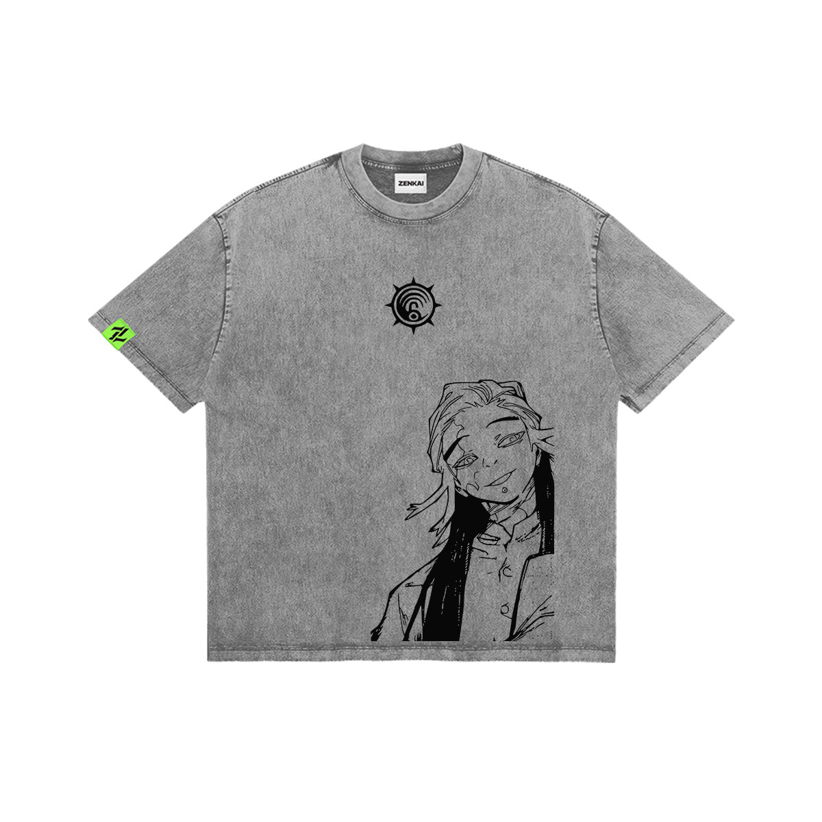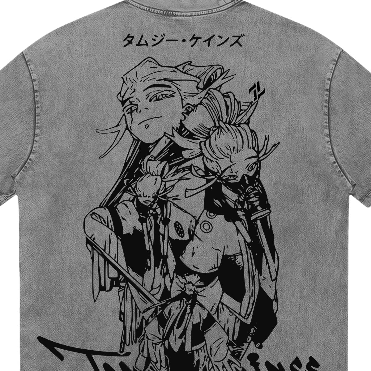 Clean up the streets with style. A high-impact tribute to the Janitor who fights with unparalleled grace. The front of this slate-grey washed tee features a minimalist Janitor sigil centered above a relaxed, half-profile sketch of Tamzy peering from the corner. The back reveals a massive, intricately detailed manga-style illustration of Tamzy Caines in full gear, his twin blades ready for action. Framed by bold, graffiti-inspired typography and Japanese katakana, this design embodies the cool composure and lethal agility of the Gachiakuta universe. A premium essential for those who appreciate detailed line work and a modern streetwear edge.