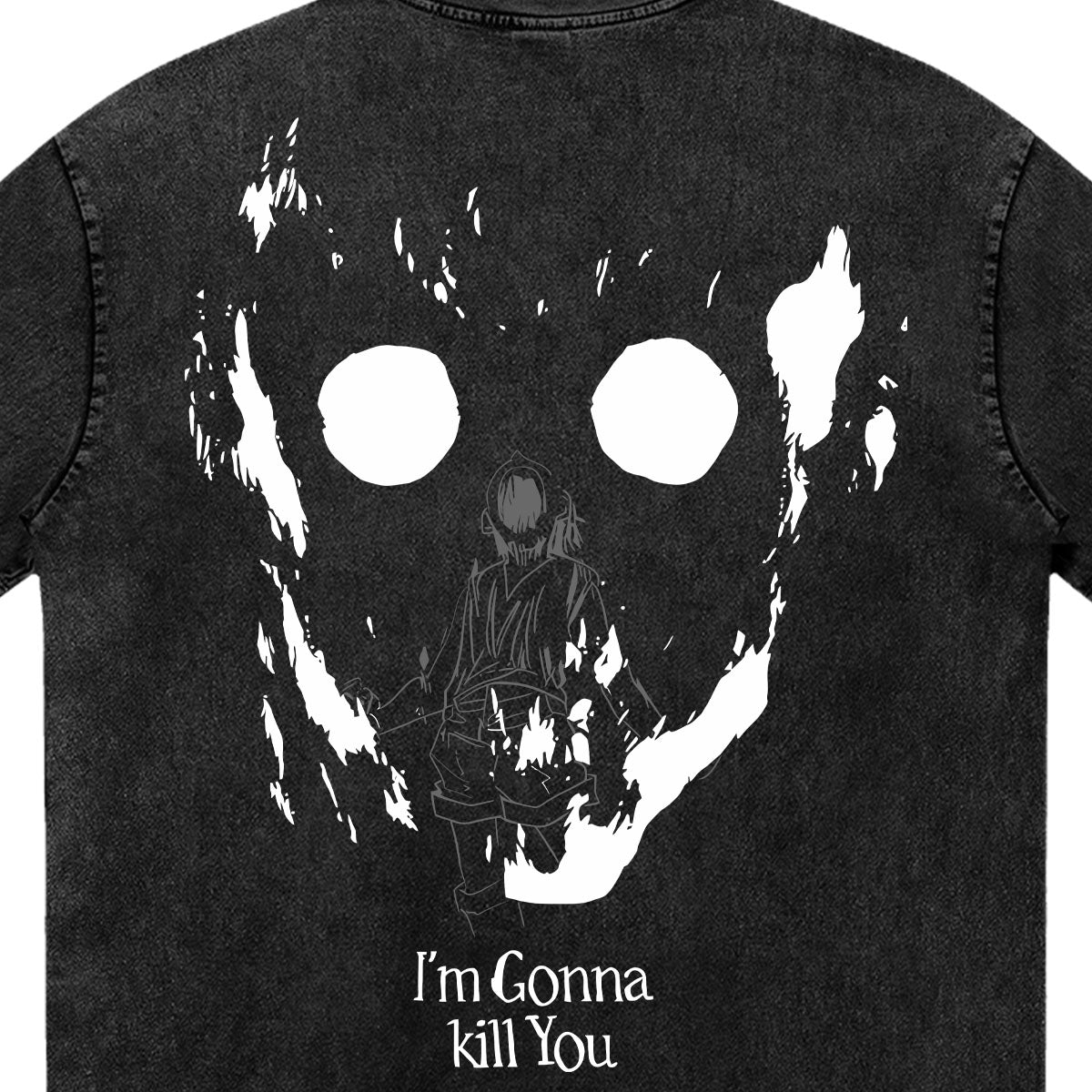 Limitless Sacrifice. A visceral tribute to the darkest moment in Hunter x Hunter. This design features the haunting silhouette of adult Gon, his nen manifesting as a towering, skeletal shadow with hollow, glowing eyes. The front and back are marked with the direct, relentless threat: "I'M GONNA KILL YOU," rendered in a distressed, scratchy font that echoes his fractured psyche. Set against a premium mineral-washed canvas, this piece captures the terrifying weight of a contract that exchanged a future for immediate, overwhelming power. For those who understand that some debts can only be paid in blood.
