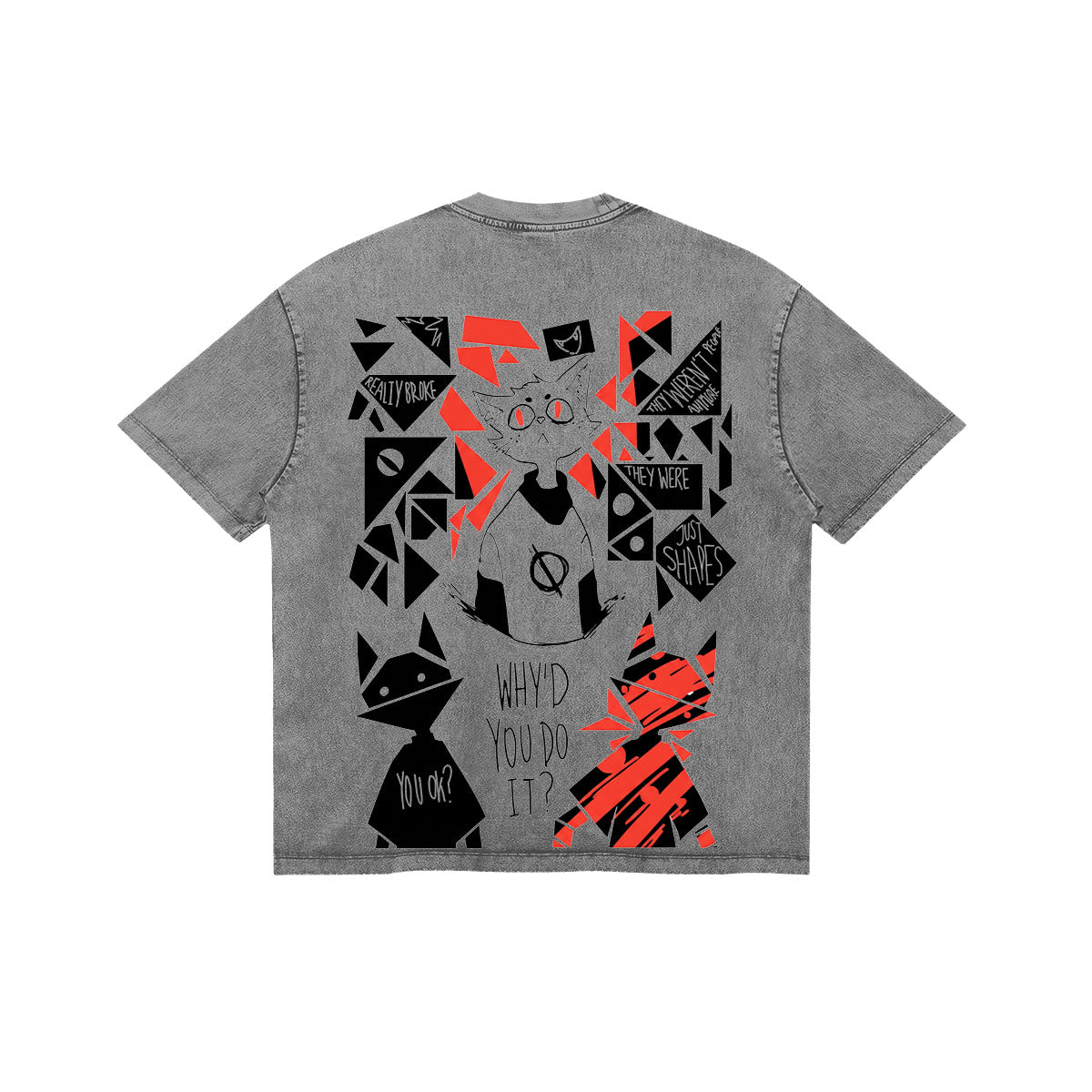 There is No Cure. A psychological horror masterpiece that dissects the fragmented world of Fundamental Paper Education. This slate-grey washed tee serves as a silent scream for the character Abbie (Aapple). The front features a minimalist, stark black void—a "Ø" symbol—representing the erasure of identity. The back is a catastrophic collapse of memory and mind, showcasing a trembling, sketch-style character trapped within a blizzard of jagged geometric fragments. Every shard carries a disturbing piece of the puzzle: "They Weren’t Real," "I’m Not Real," "Reality Broke," "It Hurt," and the haunting question, "WHY’D YOU DO IT?". With aggressive, ink-splatter textures and bleeding red accents against the desaturated fabric, this design captures the terrifying elegance of a mind consumed by its own contradictions. A premium essential for those who find beauty in the beautifully broken.