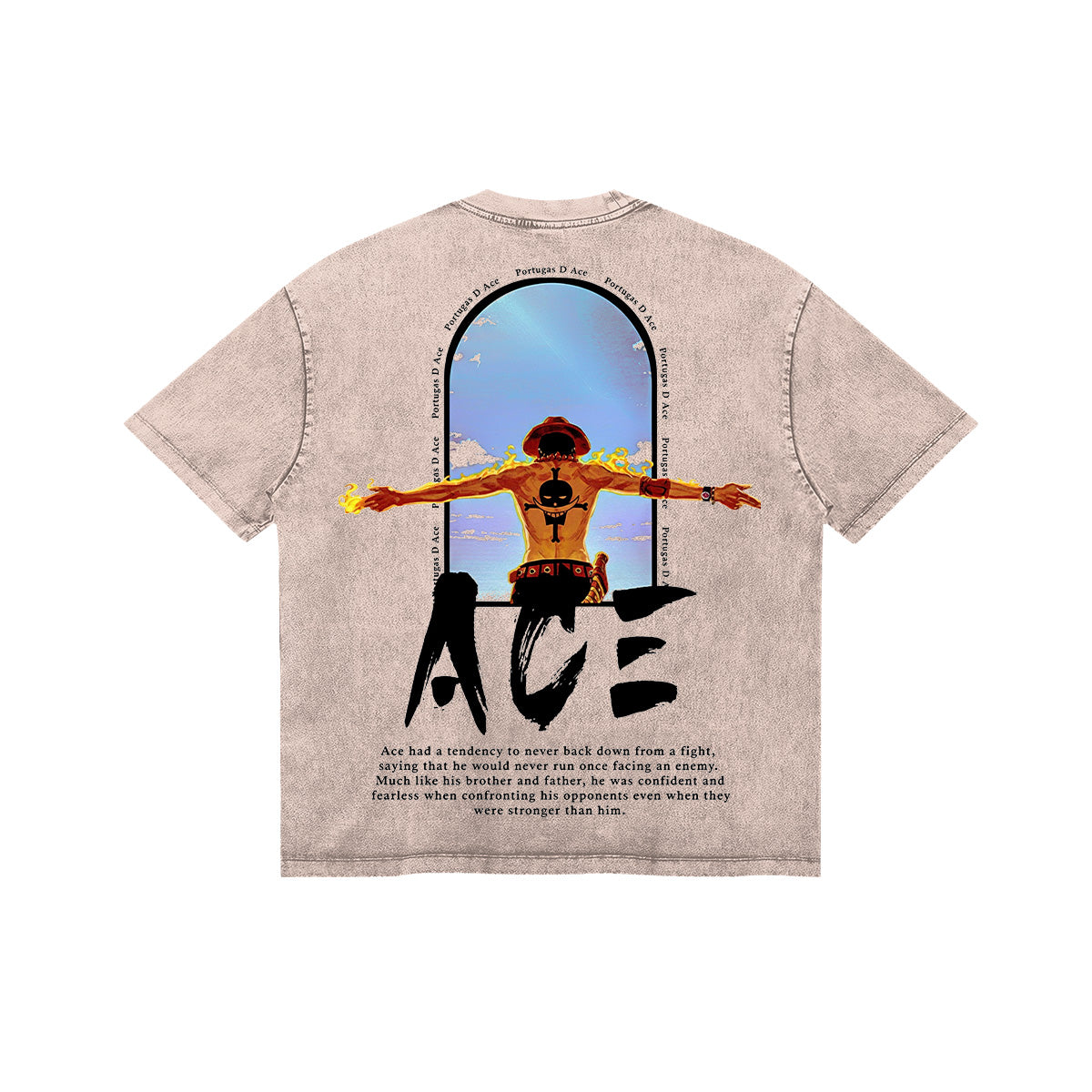 Live With No Regrets. A poetic and sun-drenched tribute to Portgas D. Ace’s final moments of freedom. This sand-beige washed tee moves away from the darkness, capturing the warmth of a life lived to the absolute fullest. The front features a minimalist playing card—the Ace of Spades—intertwined with his iconic smiling and crying charms, a silent nod to the duality of his journey. The back is a breathtaking visual, showcasing Ace’s silhouette as he stands before a vast, azure horizon, his fire glowing against the serene sky. Framed by a soulful biographical inscription and bold, brush-stroke typography, this design captures the peace of a man who found his answer in the heat of battle. A premium essential for those who carry the legacy of the Whitebeard Pirates in their hearts.