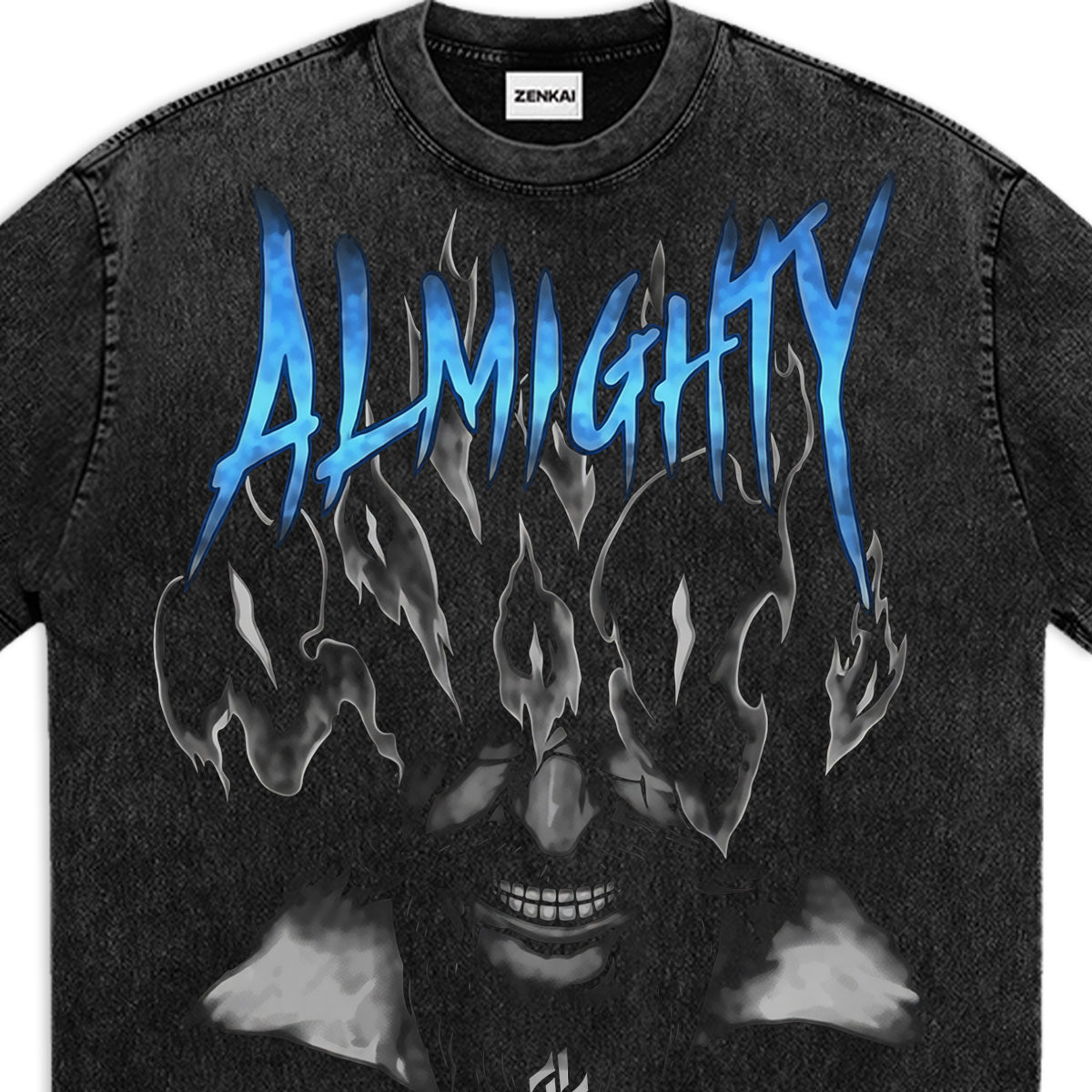 The World in 9 Days. A monumental and chilling tribute to the Father of the Quincy. The front of this charcoal-washed tee features a terrifying, high-contrast portrait of Yhwach, his face partially obscured by the shifting shadows of his many eyes. Above him, the "ALMIGHTY" typography erupts in a jagged, electric blue ice-flame effect, symbolizing his cold and absolute dominion. The back reveals the sacred Kaiser Gesang prophecy inscribed over the Quincy cross: "The confined Quincy King regains his pulse after 900 years, his mind after 90 years, his strength after 9 years, and the world in 9 days." Captured in a gritty, cinematic aesthetic, this design is a masterpiece for those who recognize the true face of power.