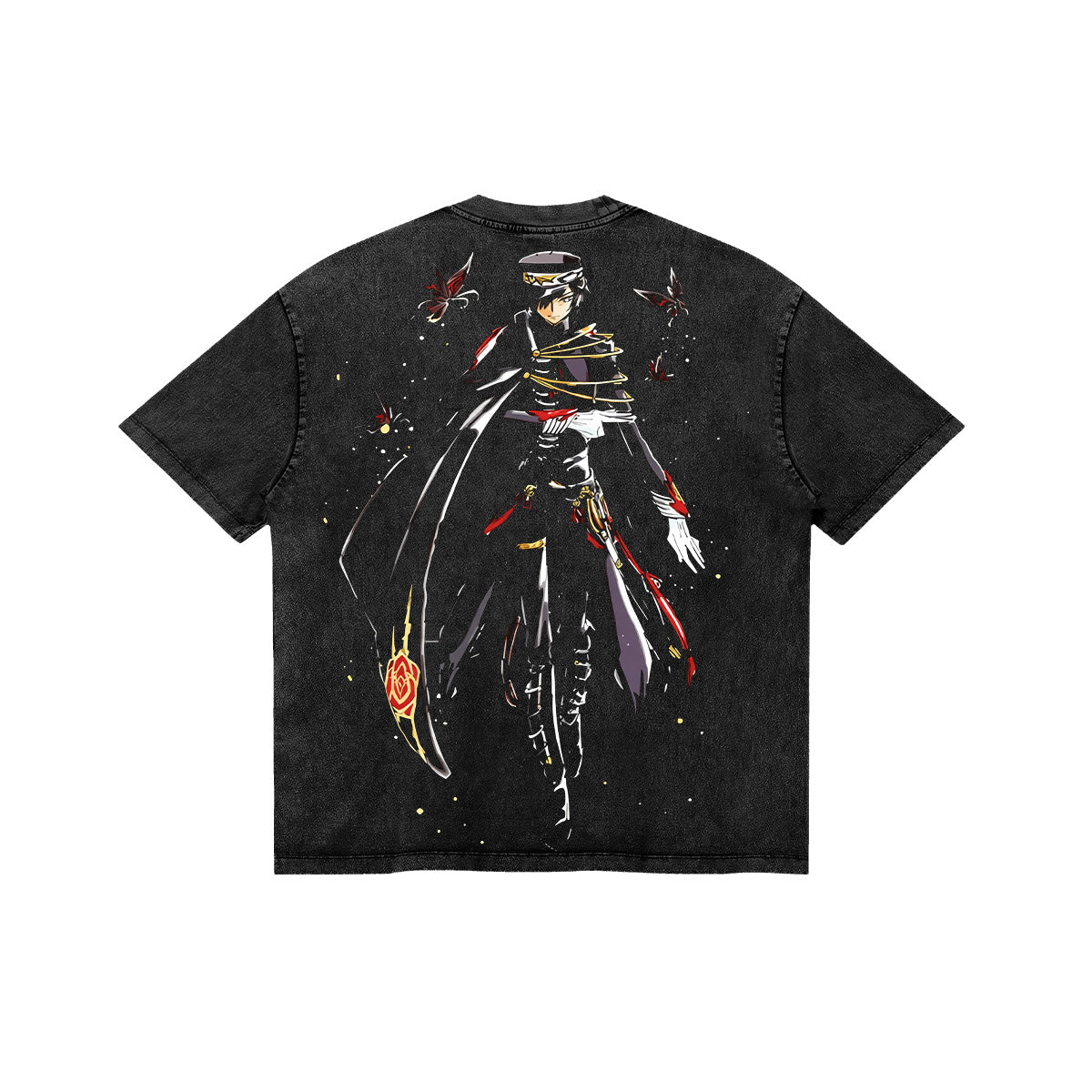 Obey me, world! A regal and high-contrast tribute to the mastermind Lelouch vi Britannia. The front of this charcoal-washed tee features the iconic crimson Geass sigil—the power of absolute obedience—positioned boldly over a minimalist ZENKAI logo. The back reveals a stunning, full-body illustration of Lelouch in his "Zero" attire, his cape flowing with military precision as he stands amidst a flurry of golden sparks and scattered rose petals. Captured in a sharp, elegant aesthetic with vibrant red and gold accents, this design embodies the tactical genius and heavy sacrifice of the man who broke the world to rebuild it.