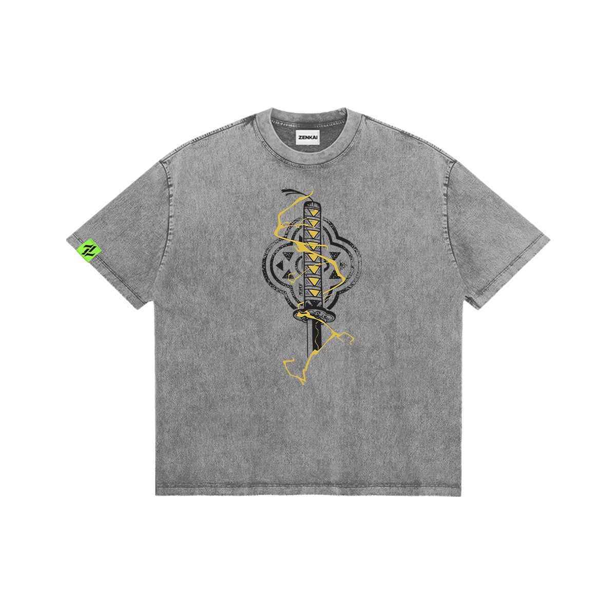 Instant Lethality. A high-voltage tribute to Zenitsu Agatsuma’s sleeping strength. The front of this mineral-washed tee features a detailed technical icon of his notched Nichirin blade, crackling with jagged yellow lightning. The back showcases a masterful split-style illustration: half Zenitsu in his usual state, half consumed by the blinding aura of the First Form. Surrounded by swirling golden energy and bold "ZENKAI" typography, this design captures the raw speed that strikes before the sound of thunder even reaches the ear. A premium piece for those who strike with precision and overwhelming velocity.