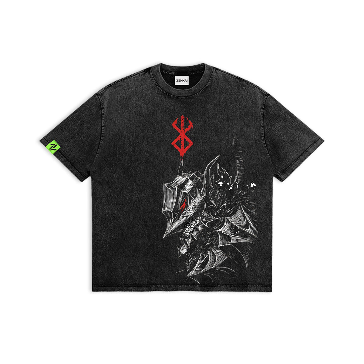 Struggle Against Causality. A raw and visceral tribute to the indomitable will of Guts. The front of this mineral-washed tee features the haunting "Brand of Sacrifice" in blood-red, looming over a detailed illustration of the Berserker Armor’s helm. The back erupts with a massive, high-contrast composition showing Guts gripping the Dragon Slayer, his face split between human resolve and the beast within. Surrounded by jagged crimson splashes and the souls of the eclipsed, this design captures the grit of a man who defies the laws of gods. A dark masterpiece for those who carry their own burdens and never stop swinging.