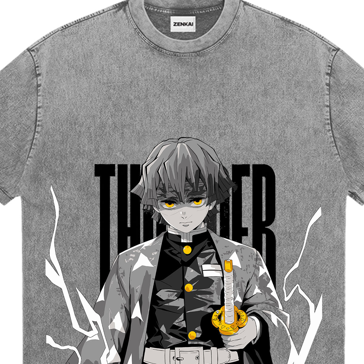 The Speed of Lightning. A striking tribute to Zenitsu Agatsuma and his mastery of the First Form. The front of this mineral-washed tee features Zenitsu in his iconic iaido stance, eyes closed in total concentration, with the bold "THUNDER" typography looming behind him. The back reveals a massive, stylized dragon made of pure electric energy—a visual representation of the raw power unleashed by his blade. Set against a rugged grey canvas, this design captures the duality of Zenitsu: the fearful boy and the lethal warrior who moves faster than the eye can see. For those who find their strength in the heat of the moment.