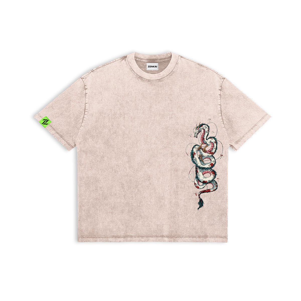 A Timeless Guardian. A graceful tribute to the legendary dragon of the spirit realm. This design features Haku in his serpentine form, intricately detailed with scales of teal and white, swirling across a soft, sand-washed canvas. It captures the elegance and mystery of the Kohaku River’s true master, blending traditional Japanese folklore with a modern streetwear silhouette. Designed for those who appreciate the beauty in the unseen and the power of ancient promises.