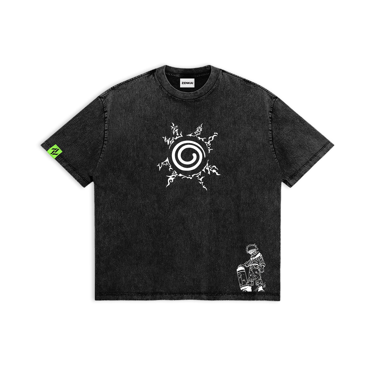 The Swiftness of a Legend. A high-voltage tribute to the fastest shinobi in history. The front of this charcoal-washed tee features the iconic spiral seal of the Uzumaki clan, surrounded by the jagged marks of the Eight Trigrams Sealing Formula. A minimalist silhouette of the Fourth Hokage stands poised at the hem, ready to strike. The back erupts with a masterful, white-ink sketch of Minato in full combat motion, wielding his signature kunai against a backdrop of roaring orange flames and sparks. This piece captures the brilliance and protective spirit of Konoha’s savior.