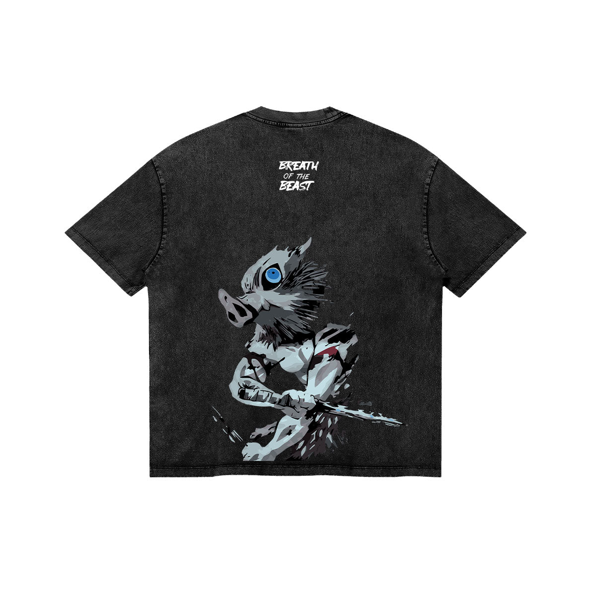 Unleash the Beast. A raw and feral tribute to the self-taught warrior of the mountains. The front of this charcoal-washed tee features a minimalist, chibi-style boar mask puffed with steam—a nod to Inosuke’s constant high-energy presence. The back reveals a cinematic masterpiece: Inosuke in mid-battle, his iconic boar mask glowing with a piercing blue eye as he grips his jagged, dual katanas. Framed by the text "BREATH OF THE BEAST" and chaotic ink splatters, this design embodies the primal strength and relentless spirit of a demon slayer who knows no fear. A premium essential for those who forge their own path through the wild.