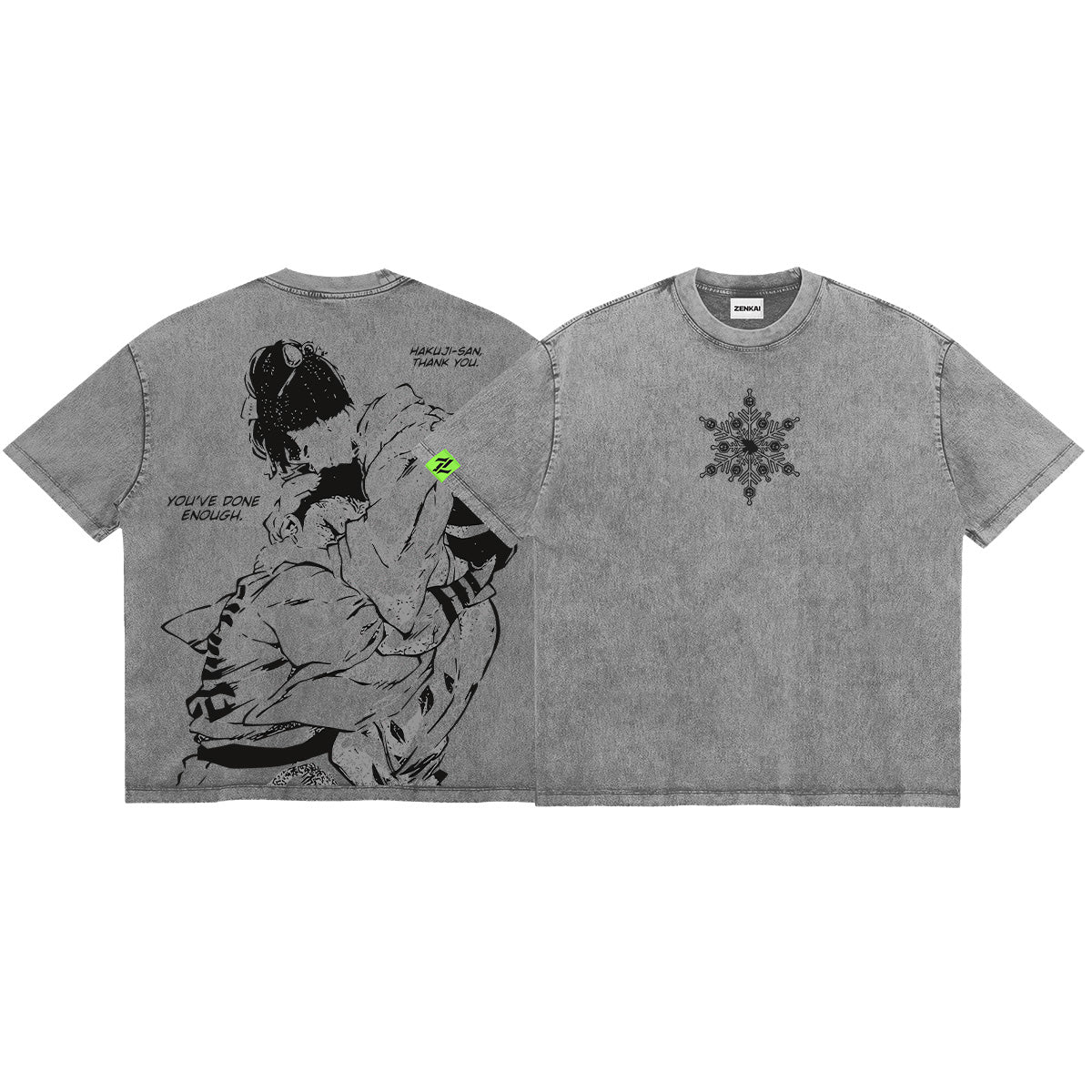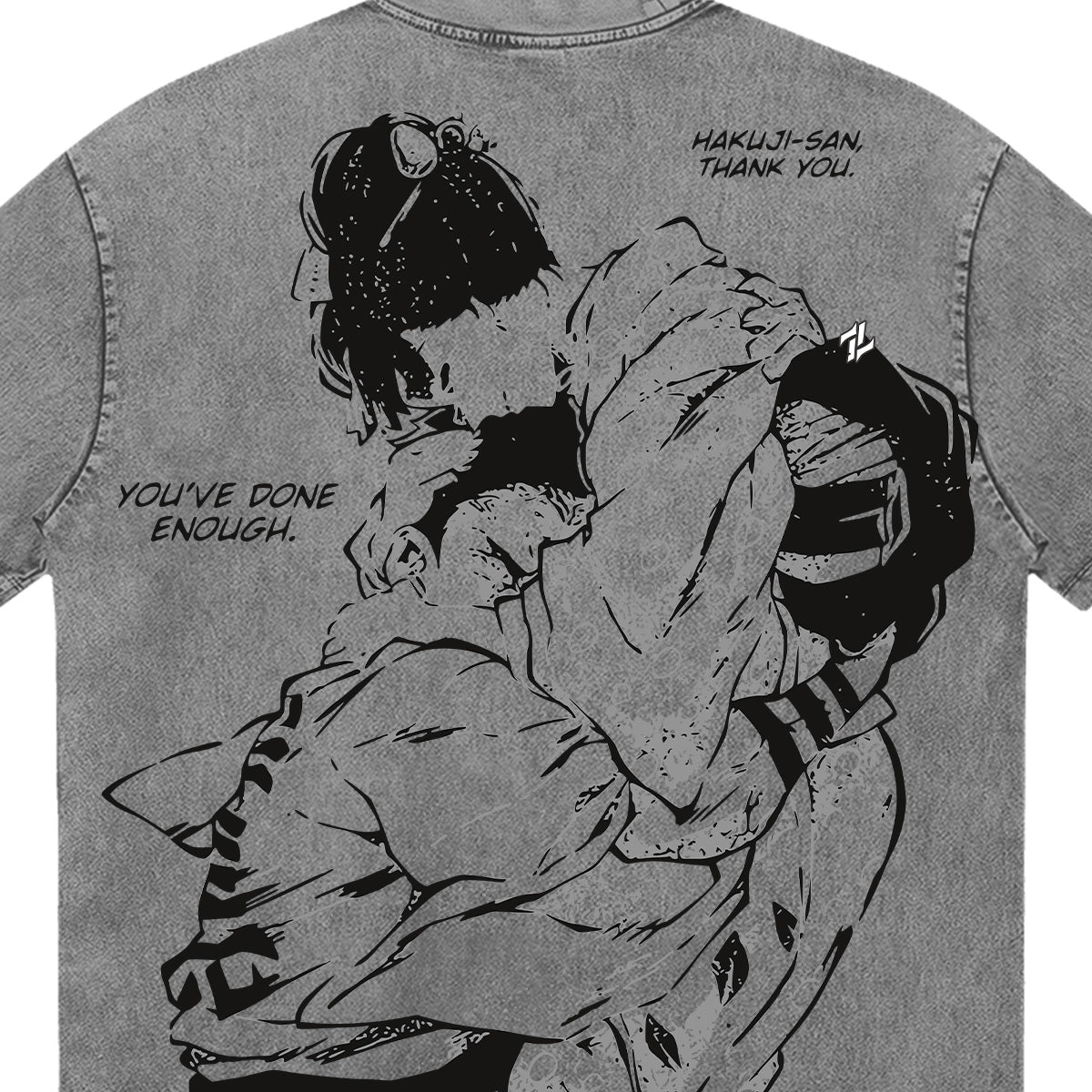 You’ve done enough." A poignant and soul-stirring tribute to the man behind the monster. The front of this slate-grey washed tee features a intricate, fine-line Compass Needle snowflake, rendered in a somber black ink that represents Hakuji's martial arts legacy. The back reveals a heart-wrenching manga-style illustration of Koyuki embracing Hakuji, pulling him back from the brink of darkness. Accompanied by the devastatingly beautiful quotes "HAKUJI-SAN, THANK YOU" and "YOU’VE DONE ENOUGH," this design embodies the power of love, the weight of regret, and the ultimate peace found in forgiveness. A premium essential for those who find strength in the most human of emotions.