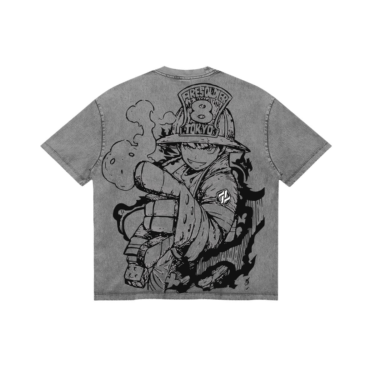 Smile in the face of fear. A powerful and cinematic tribute to the Fourth Pillar. The front of this slate-grey washed tee features a minimalist sketch of Shinra in his protective bunker gear, positioned below the bold, gothic Fire Force title and Japanese kanji. The back reveals a massive, high-contrast manga illustration of Shinra pointing toward his destiny, his eyes burning with intensity as smoke and embers swirl around him. Rendered in a raw, ink-heavy style, this design embodies the courage, the tragedy, and the explosive power of the hero who fights to save souls from the flames.