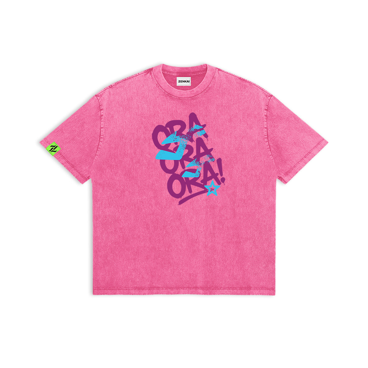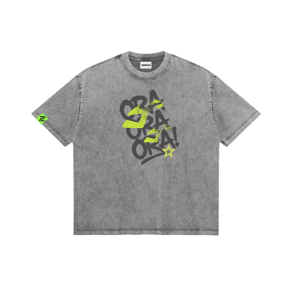 Yare Yare Daze. A high-energy, street-style tribute to the most legendary delinquent in anime history. The front of this mineral-washed tee explodes with neon yellow "ORA ORA ORA!" typography, while the back showcases a masterful graffiti-style portrait of Jotaro Kujo. Adorned with jagged stars, electric blue accents, and his signature golden chain, this design captures the raw, rebellious spirit of the Stardust Crusaders. Set against a rugged grey canvas, it’s a masterpiece for those who command respect and let their Stand do the talking.