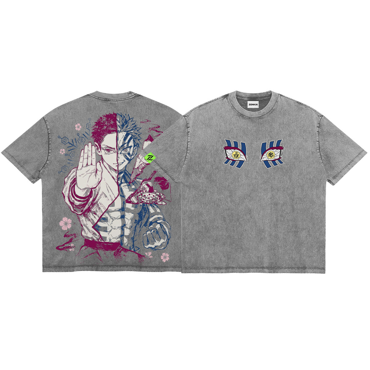 The Pursuit of Strength. A striking and rhythmic tribute to the ultimate martial artist of the demon world. The front of this mineral-washed tee features a unique "eyes of the moon" graphic, showcasing Akaza’s piercing gaze and his Rank 3 kanji. The back reveals a masterful split-portrait: one side displaying his formidable demon form with jagged blue markings, the other a faint, sketch-style memory of his human life. Surrounded by cherry blossom petals and the swirling patterns of his Compass Needle technique, this design captures the raw, disciplined power of a warrior who lives only for the perfect fight. A premium piece for those who strive for peak performance and never stop training.