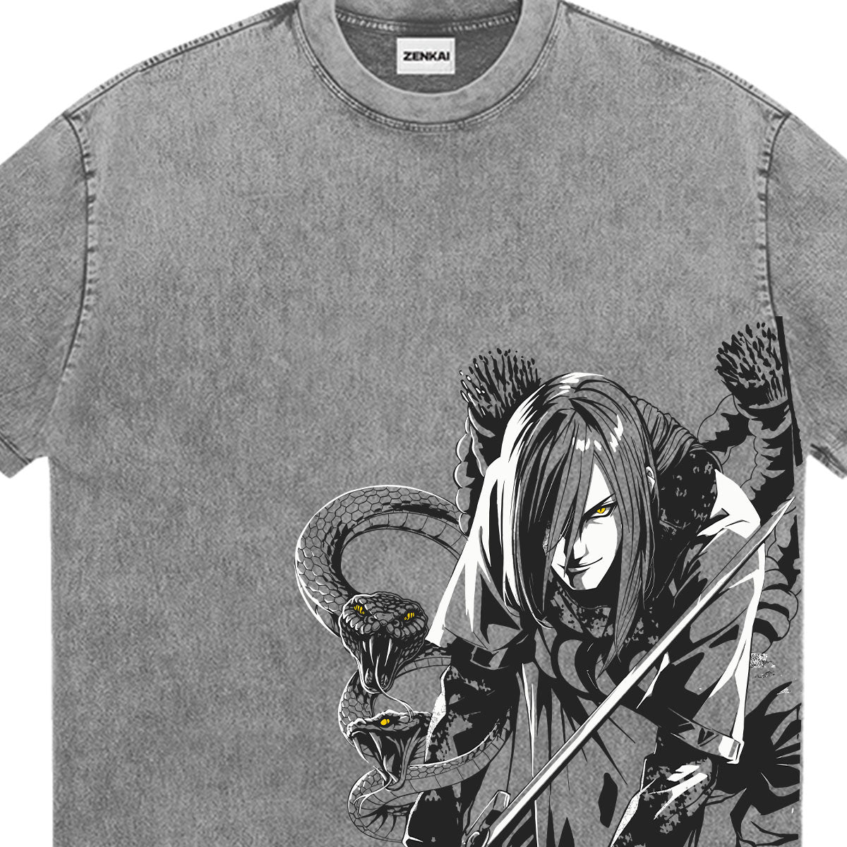 The Pursuit of Eternal Knowledge. A chilling tribute to Orochimaru, the rogue ninja whose ambition knows no bounds. The front of this mineral-washed tee showcases a masterfully detailed illustration of Orochimaru, his piercing yellow eyes and predatory smirk framed by his signature summoned snakes. The back keeps it sharp and mysterious with a minimalist Oni-style mask pierced by a kunai, symbolizing his dark experiments and connection to the underworld. Set against a rugged grey canvas, this design captures the essence of a man who cheated death to master every jutsu in existence. For those who move in the shadows and seek power without compromise.