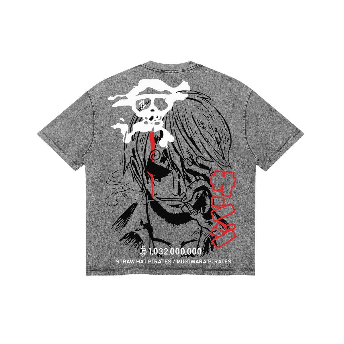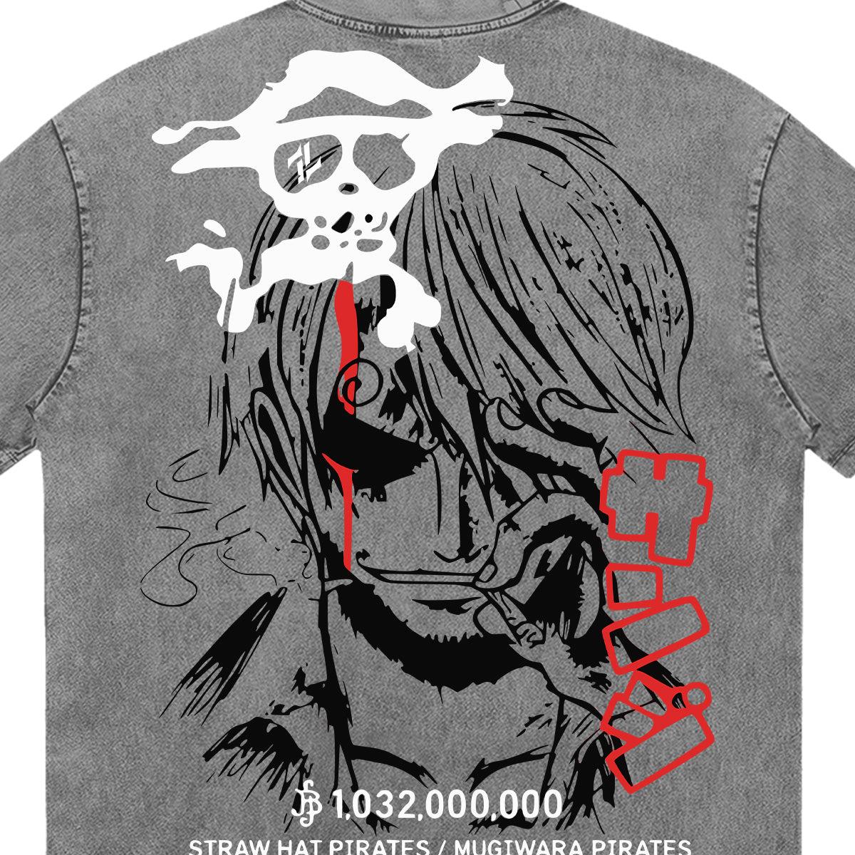 The Cook of the Seas. A high-impact tribute to Sanji’s lethal elegance and burning passion. The front of this mineral-washed tee features a silhouette of the Vinsmoke prince alongside a bold "BLACK LEG" typography and his signature skull icon. The back reveals a massive, sketch-style portrait of Sanji mid-smoke, his gaze intensified by a single splash of crimson fire. With his staggering bounty of 1,032,000,000 Berries marked at the bottom, this design captures the raw power of a man who fights with his feet to protect his hands for cooking. A premium piece for those who move with speed, style, and a fiery heart.