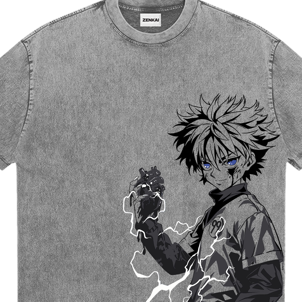The Cold Edge of Lightning. A visceral tribute to Killua Zoldyck’s transition from a loyal friend to a lethal protector. This design captures the moment he taps into his primal instincts, holding a literal heart in his hand while surrounded by the jagged electric aura of his "Godspeed" technique. The muted grey mineral wash emphasizes his haunting silhouette, while the piercing blue eyes serve as a warning: the hunter has become the hunted. For those who move faster than sound and strike with absolute precision.