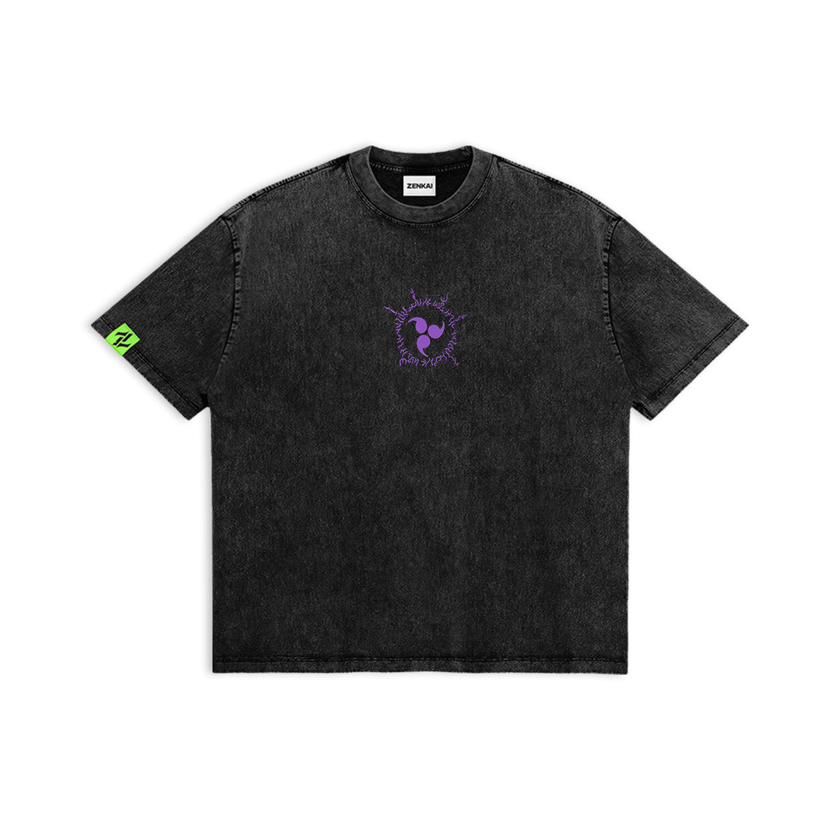 The ultimate offensive defense. A cold and piercing tribute to Sasuke Uchiha’s mastery over the Mangekyo Sharingan. The front of this charcoal-washed tee features the distinct swirl of Sasuke’s Eternal Mangekyo, integrated into a sharp ZENKAI logo. The back reveals a massive, spectral illustration of his Susanoo’s skeletal form, wreathed in electric purple flames and dark energy. Captured in a gritty, high-contrast aesthetic, this design embodies the vengeance and overwhelming power of the last Uchiha. A premium essential for those who walk the path of shadows.
