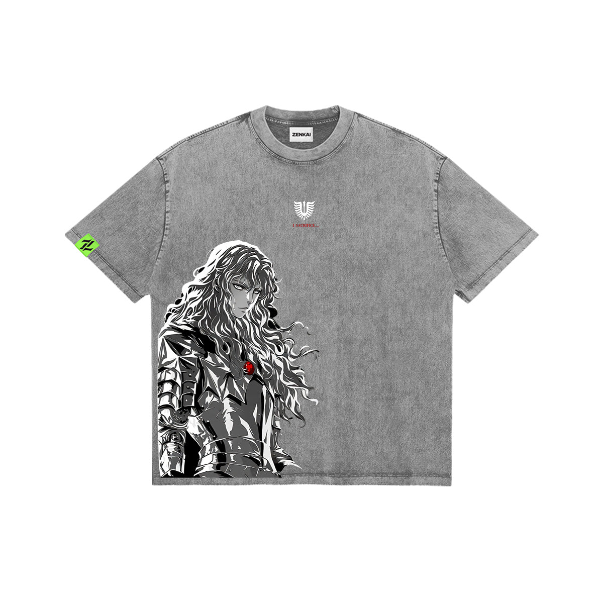 The Chosen One. A majestic and haunting tribute to Griffith, the man who would be King. The front of this mineral-washed tee features a stunning, high-contrast illustration of Griffith in his silver armor, his flowing hair and sharp gaze captured in a detailed, ink-etching aesthetic. A single, blood-red Beherit accent sits at his chest, symbolizing the heavy price of his dream. Above him, the minimalist "Falcon of Light" crest marks his divine status. The back is kept clean and authoritative, featuring his name "GRIFFITH" and the iconic "BERSERK" typography, cementing this as a premium piece for those who pursue their own light at any cost.