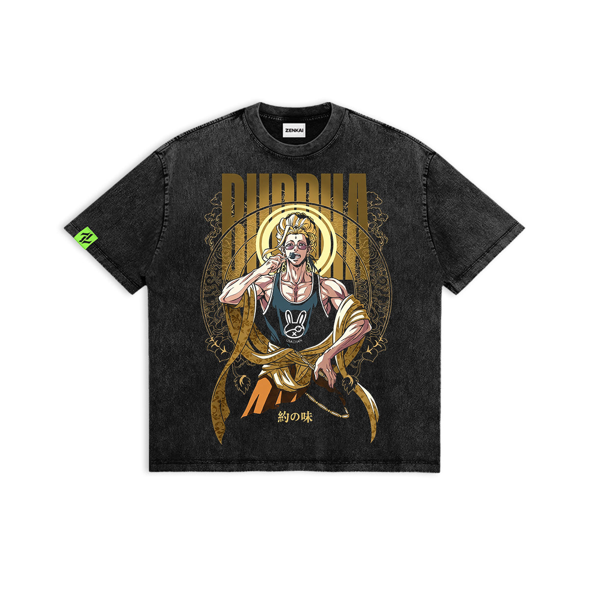 I Alone Am The Honored One. A bold and divine tribute to the god who chose humanity. This design features a vibrant, full-color back composition of Buddha, radiating absolute confidence. Framed by a golden mandala halo and bold "BUDDHA" typography, he is depicted in his signature modern look, holding his prayer beads and glowing with enlightened energy. With intricate golden filigree and traditional script accents, this piece captures the rebellious and peaceful spirit of the universe’s most unique warrior. A masterpiece for those who follow no master but their own soul.