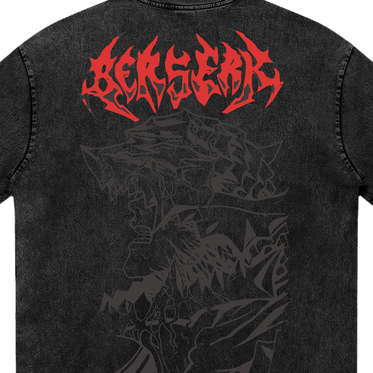 He who fights monsters. A visceral and uncompromising tribute to the man who defies fate. The front of this charcoal-washed tee features the iconic Brand of Sacrifice, rendered in a striking blood-red ink that contrasts sharply with the dark, weathered fabric. The back reveals a massive, atmospheric masterpiece: Guts encased in the terrifying Berserker Armor, his silhouette emerging from the shadows in a high-contrast, ink-etched style. Framed by aggressive, jagged typography of the "BERSERK" title in crimson, this design embodies the endless struggle and the indomitable will of the world’s ultimate survivor.