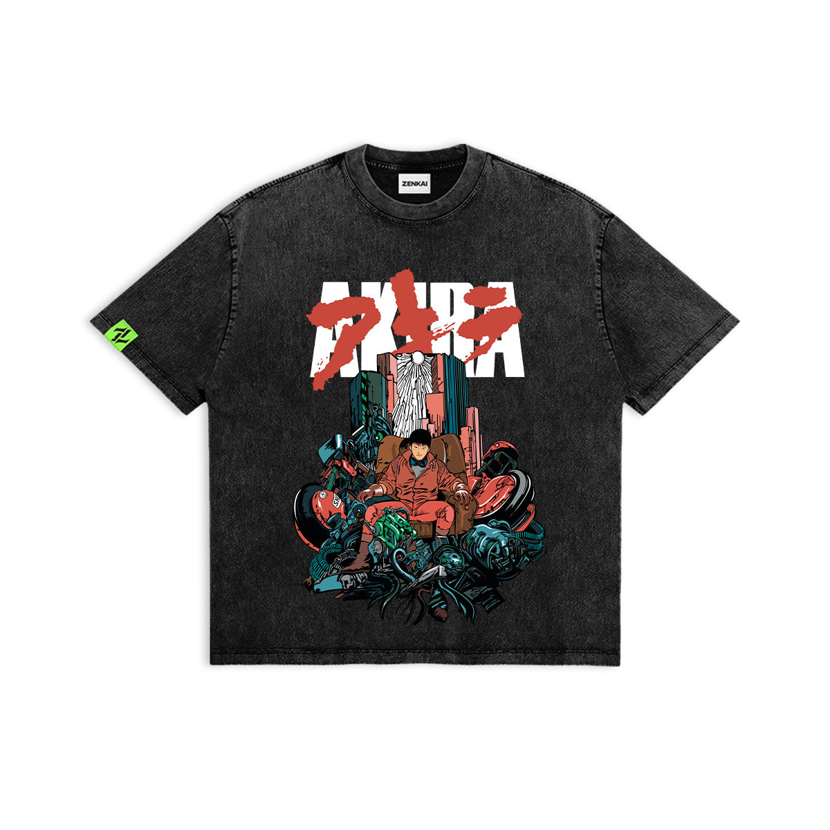 The King of Neo-Tokyo. A definitive tribute to the masterpiece that birthed a genre. This design features Kaneda in his iconic red suit, ruling over a wasteland of scrap metal and high-tech ruins. With bold, classic "Akira" typography and a gritty, vintage-washed aesthetic, it captures the raw energy of a future where survival is the only law.