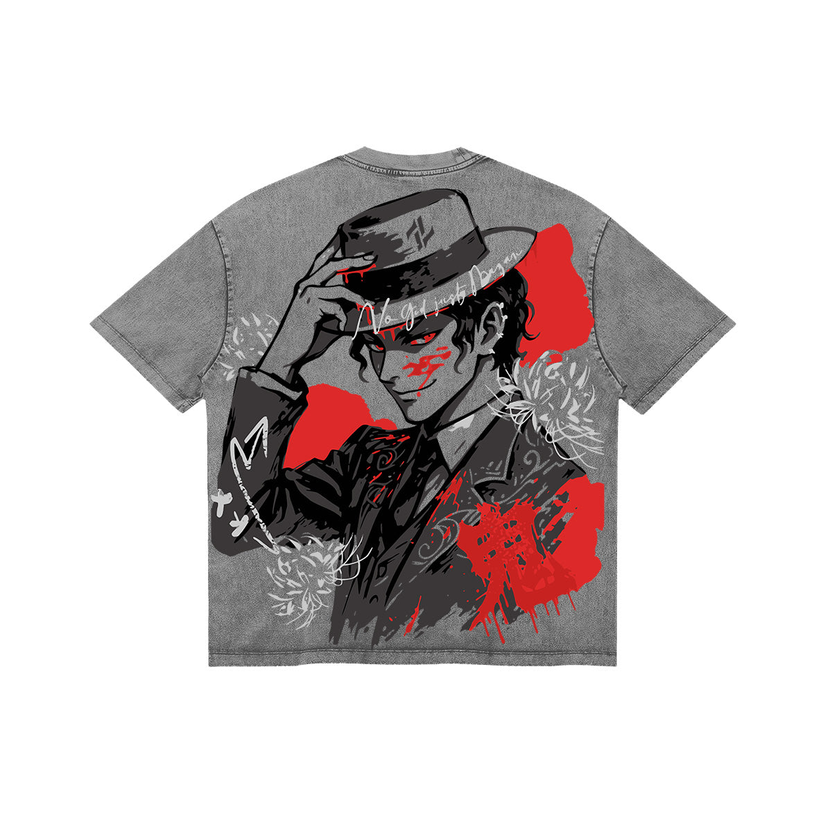 Bow Before Your Master. A chilling and elegant tribute to Muzan Kibutsuji, the King of Demons. The front of this mineral-washed tee features a striking graffiti-style "YOU EXIST ONLY TO SERVE ME" typography alongside traditional Japanese kanji, dripping with a shadow-ink effect. The back reveals a masterful, high-contrast portrait of Muzan in his iconic fedora, his piercing crimson eyes and sinister smirk highlighted by bold blood-red splashes. Captured in a jagged, sketch-style aesthetic with floral spider lily accents, this design captures the terrifying grace of a being who commands life and death. A premium piece for those who rule through strength and settle for nothing less than perfection.