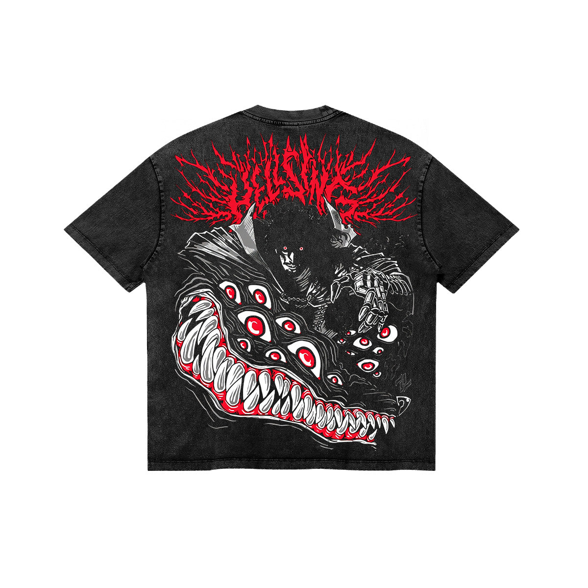 The Bird of Hermes is my name, eating my wings to make me tame. A visceral and blood-soaked tribute to the ultimate vampire. The front of this charcoal-washed tee features a striking graphic of Alucard’s gloved hands, one marked with the Hellsing seal, framing a singular, watchful eye. The back explodes with a macabre masterpiece: Alucard emerging from a mass of shifting shadows, gnashing teeth, and countless eyes of the souls he has consumed. Topped with a jagged, blood-red "HELLSING" typography, this design captures the terrifying elegance of Level 0. A definitive essential for those who embrace the darkness.